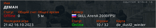 Играет на Counter Strike 1.6 сервере. Страна: РоссияПервый раз замечен 21:30 16.10.2023
