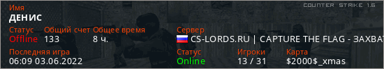 Играет на Counter Strike 1.6 сервере. Страна: РоссияПервый раз замечен 14:08 05.01.2022
