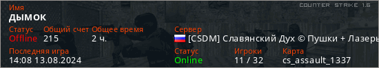 Играет на Counter Strike 1.6 сервере. Страна: РоссияПервый раз замечен 12:35 22.07.2024