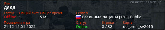 Играет на Counter Strike 1.6 сервере. Страна: РоссияПервый раз замечен 20:48 15.01.2025