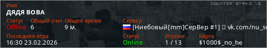 Играет на Counter Strike 1.6 сервере. Страна: РоссияПервый раз замечен 15:15 23.02.2026