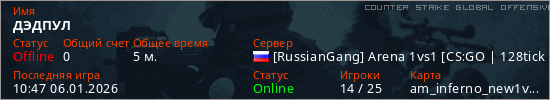 Играет на Counter Strike Global Offensive сервере. Страна: РоссияПервый раз замечен 10:28 06.01.2026