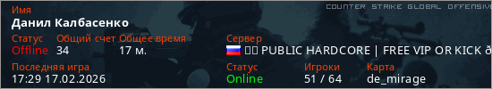 Играет на Counter Strike Global Offensive сервере. Страна: РоссияПервый раз замечен 13:33 08.02.2026