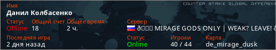 Играет на Counter Strike Global Offensive сервере. Страна: РоссияПервый раз замечен 21:14 18.12.2025