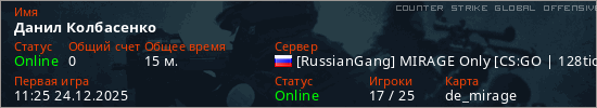Играет на Counter Strike Global Offensive сервере. Страна: РоссияПервый раз замечен 11:25 24.12.2025