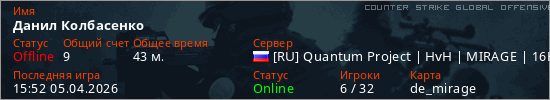 Играет на Counter Strike Global Offensive сервере. Страна: РоссияПервый раз замечен 20:26 28.03.2026