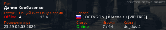 Играет на Counter Strike Source сервере. Страна: РоссияПервый раз замечен 17:17 27.01.2026