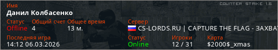 Играет на Counter Strike 1.6 сервере. Страна: РоссияПервый раз замечен 15:18 12.02.2026