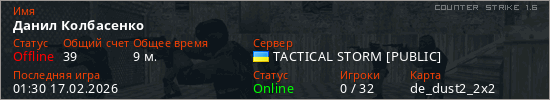 Играет на Counter Strike 1.6 сервере. Страна: УкраинаПервый раз замечен 00:38 17.02.2026