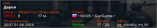 Играет на Counter Strike Source сервере. Страна: РоссияПервый раз замечен 19:06 31.05.2024