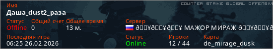 Играет на Counter Strike Global Offensive сервере. Страна: РоссияПервый раз замечен 01:27 26.02.2026