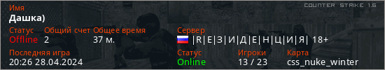 Играет на Counter Strike 1.6 сервере. Страна: РоссияПервый раз замечен 19:43 25.04.2024