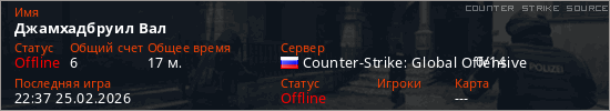 Играет на Counter Strike Source сервере. Страна: РоссияПервый раз замечен 17:45 23.02.2026