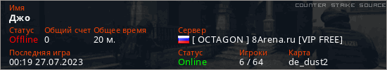 Играет на Counter Strike Source сервере. Страна: РоссияПервый раз замечен 20:02 25.07.2023
