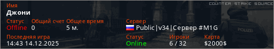 Играет на Counter Strike Source сервере. Страна: РоссияПервый раз замечен 14:39 14.12.2025