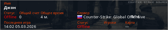 Играет на Counter Strike Source сервере. Страна: РоссияПервый раз замечен 13:32 05.03.2026