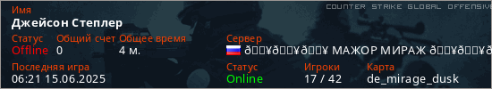 Играет на Counter Strike Global Offensive сервере. Страна: РоссияПервый раз замечен 05:36 15.06.2025