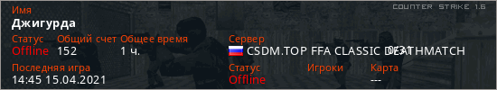Играет на Counter Strike 1.6 сервере. Страна: РоссияПервый раз замечен 11:42 09.06.2020