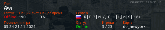 Играет на Counter Strike 1.6 сервере. Страна: РоссияПервый раз замечен 21:46 24.09.2021