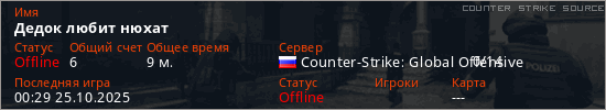 Играет на Counter Strike Source сервере. Страна: РоссияПервый раз замечен 23:37 24.10.2025