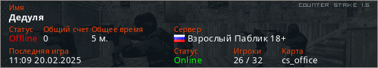 Играет на Counter Strike 1.6 сервере. Страна: РоссияПервый раз замечен 11:05 20.02.2025