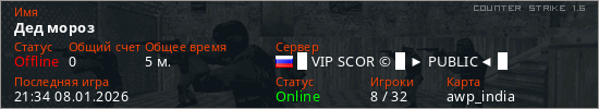 Играет на Counter Strike 1.6 сервере. Страна: РоссияПервый раз замечен 21:31 08.01.2026