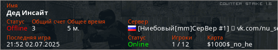 Последний раз был в сети 21:52 02.07.2025 Игрок с таким ником замечен на 3 серверах