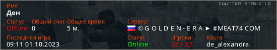 Играет на Counter Strike 1.6 сервере. Страна: РоссияПервый раз замечен 09:09 01.10.2023