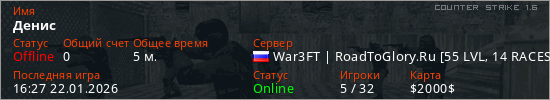 Играет на Counter Strike 1.6 сервере. Страна: РоссияПервый раз замечен 16:25 22.01.2026