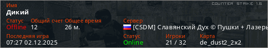 Играет на Counter Strike 1.6 сервере. Страна: РоссияПервый раз замечен 05:24 27.11.2025