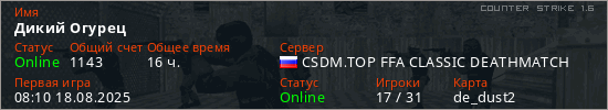 Играет на Counter Strike 1.6 сервере. Страна: РоссияПервый раз замечен 08:10 18.08.2025