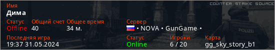 Играет на Counter Strike Source сервере. Страна: РоссияПервый раз замечен 22:52 10.03.2023