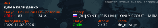 Играет на Counter Strike Global Offensive сервере. Страна: РоссияПервый раз замечен 00:12 08.02.2026