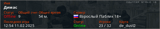 Играет на Counter Strike 1.6 сервере. Страна: РоссияПервый раз замечен 15:09 29.06.2024
