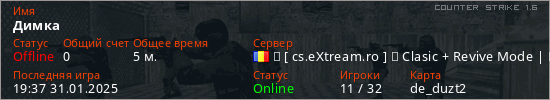 Играет на Counter Strike 1.6 сервере. Страна: РумынияПервый раз замечен 19:35 31.01.2025