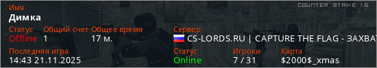 Играет на Counter Strike 1.6 сервере. Страна: РоссияПервый раз замечен 13:14 23.03.2024