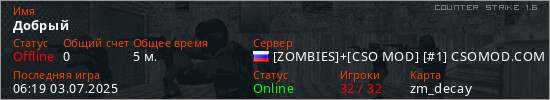 Играет на Counter Strike 1.6 сервере. Страна: РоссияПервый раз замечен 06:10 03.07.2025