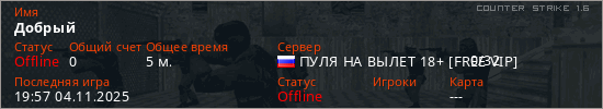 Играет на Counter Strike 1.6 сервере. Страна: РоссияПервый раз замечен 19:50 04.11.2025