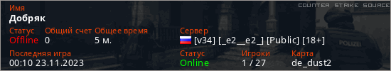 Играет на Counter Strike Source сервере. Страна: РоссияПервый раз замечен 23:25 22.11.2023