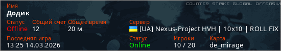 Играет на Counter Strike Global Offensive сервере. Страна: УкраинаПервый раз замечен 10:37 14.03.2026