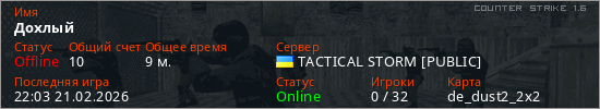 Играет на Counter Strike 1.6 сервере. Страна: УкраинаПервый раз замечен 21:03 21.02.2026