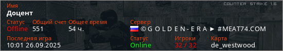 Играет на Counter Strike 1.6 сервере. Страна: РоссияПервый раз замечен 09:14 11.07.2023