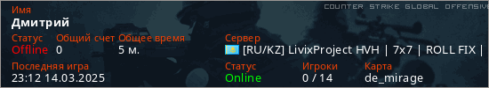 Играет на Counter Strike Global Offensive сервере. Страна: КазахстанПервый раз замечен 23:08 14.03.2025