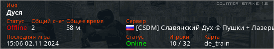 Играет на Counter Strike 1.6 сервере. Страна: РоссияПервый раз замечен 12:55 19.10.2024