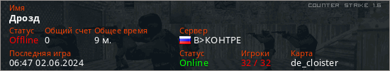Играет на Counter Strike 1.6 сервере. Страна: РоссияПервый раз замечен 11:05 01.06.2024