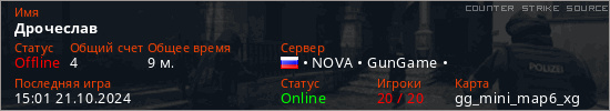 Играет на Counter Strike Source сервере. Страна: РоссияПервый раз замечен 14:51 21.10.2024
