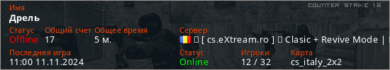 Играет на Counter Strike 1.6 сервере. Страна: РумынияПервый раз замечен 10:54 11.11.2024