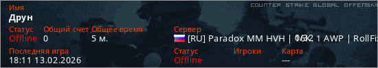 Играет на Counter Strike Global Offensive сервере. Страна: РоссияПервый раз замечен 17:59 13.02.2026