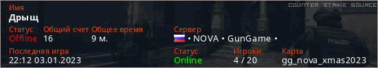 Играет на Counter Strike Source сервере. Страна: РоссияПервый раз замечен 22:05 03.01.2023