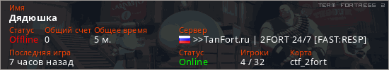Играет на Team Fortress 2 сервере. Страна: РоссияПервый раз замечен 22:39 28.04.2026